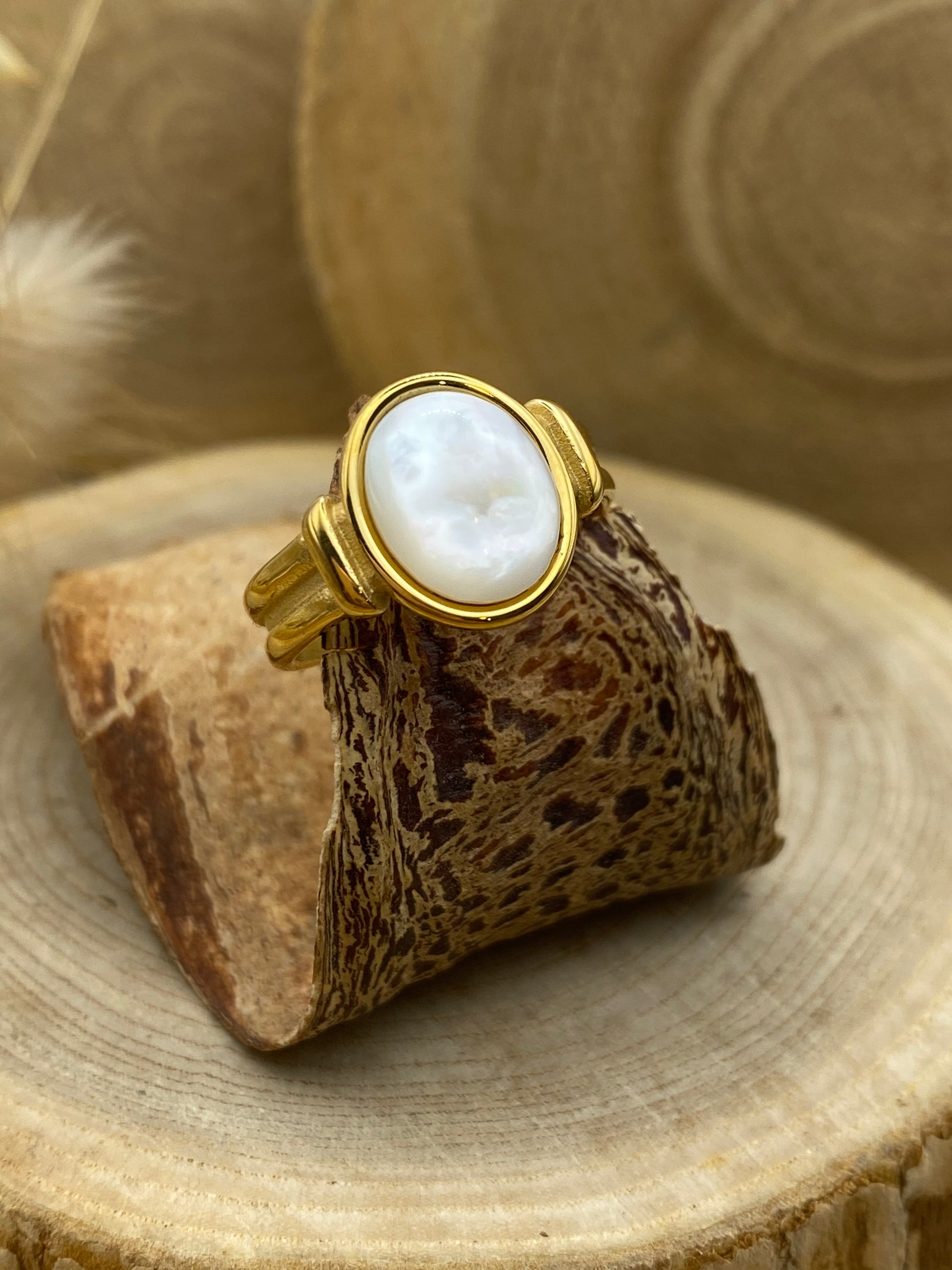 Cédez au plaisir de porter la bague Anzi. On adore l’association du doré avec la nacre pour un style vintage et authentique à notre doigt.