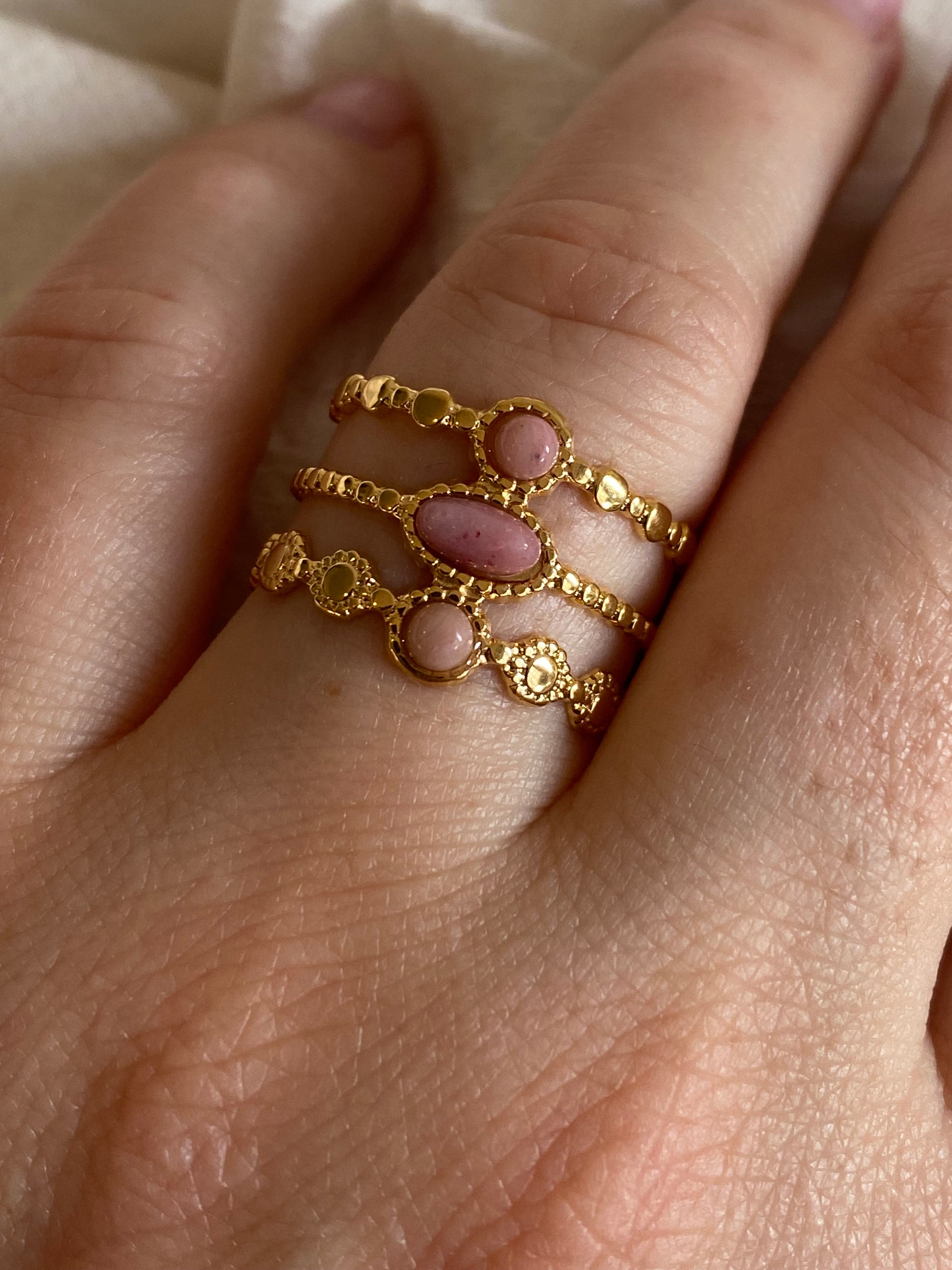 Découvrez la beauté de la bague Klara en acier inoxydable doré, ornée de pierres roses. Son design élégant et résistant en fait un accessoire idéal pour toutes occasions. Ajoutez une touche de couleur et d'éclat à votre tenue avec cette bague intemporelle et durable.