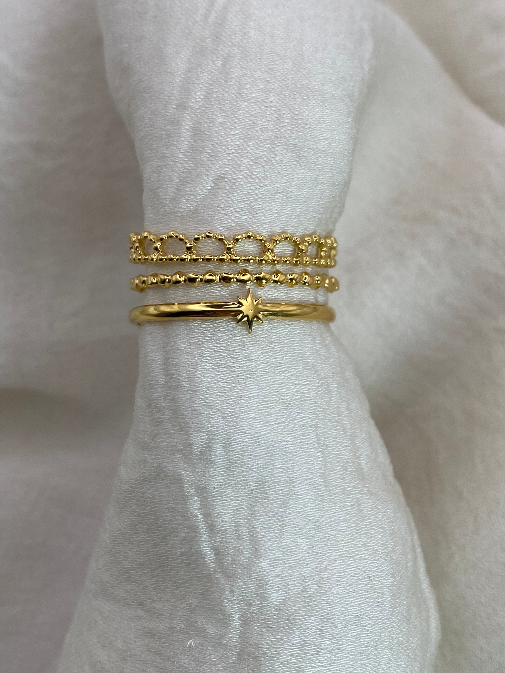 La bague Nélie est un bijou de qualité en acier inoxydable, formée de trois anneaux dorés pour un style élégant et moderne. Fabriquée avec des matériaux durables, elle promet de résister à l'usure quotidienne. Ajoutez une touche sophistiquée à votre tenue avec cette bague polyvalente.