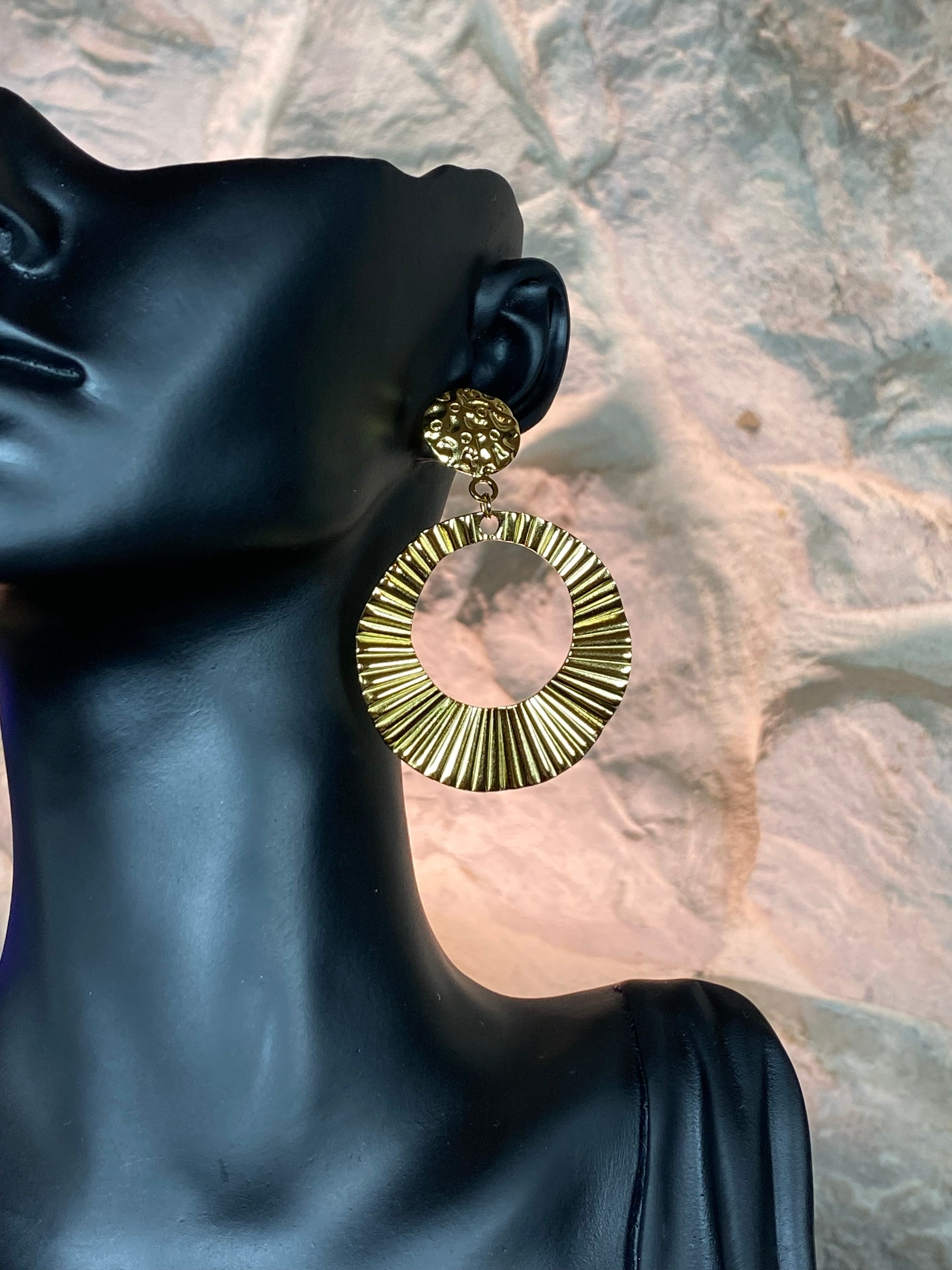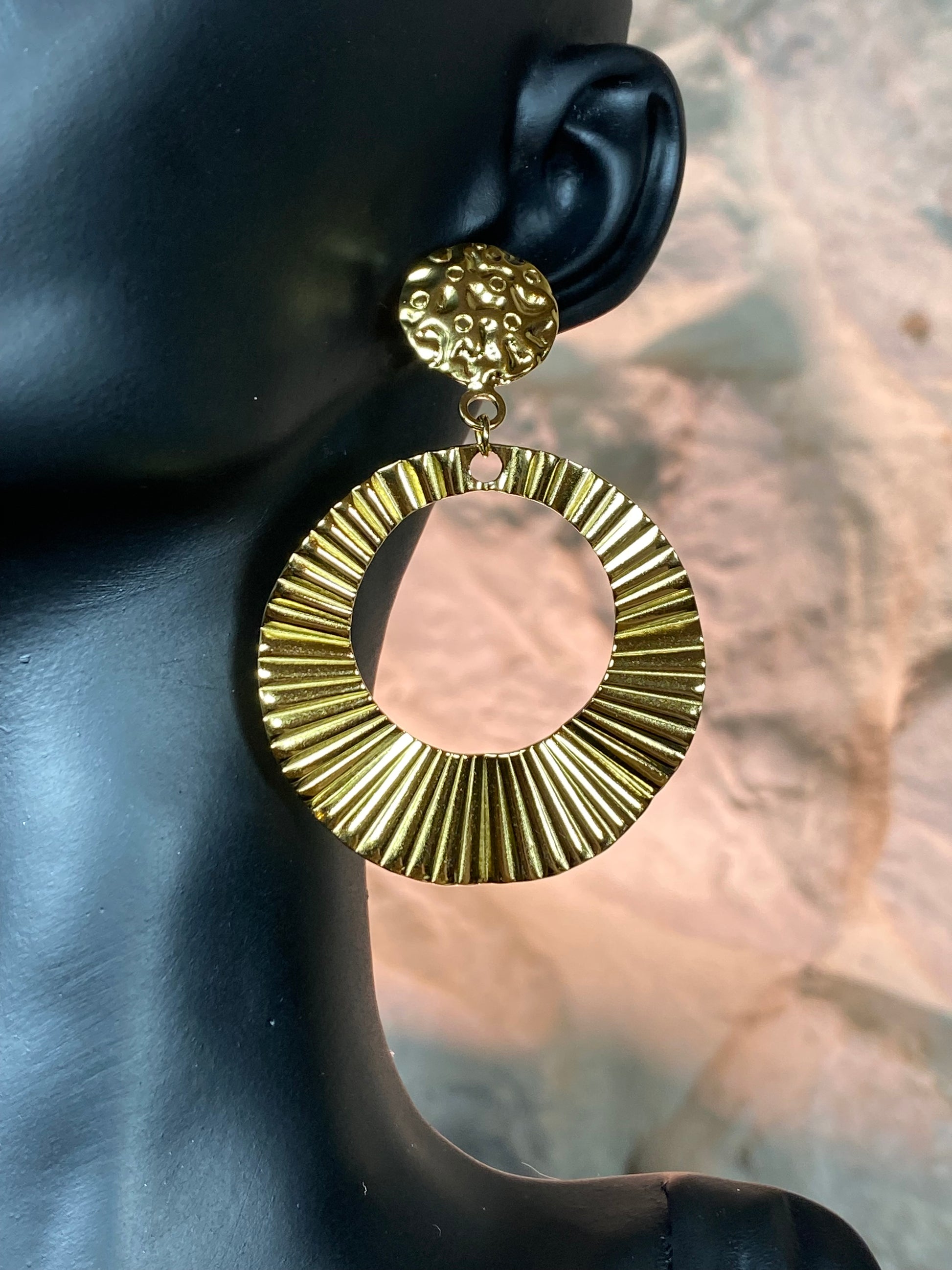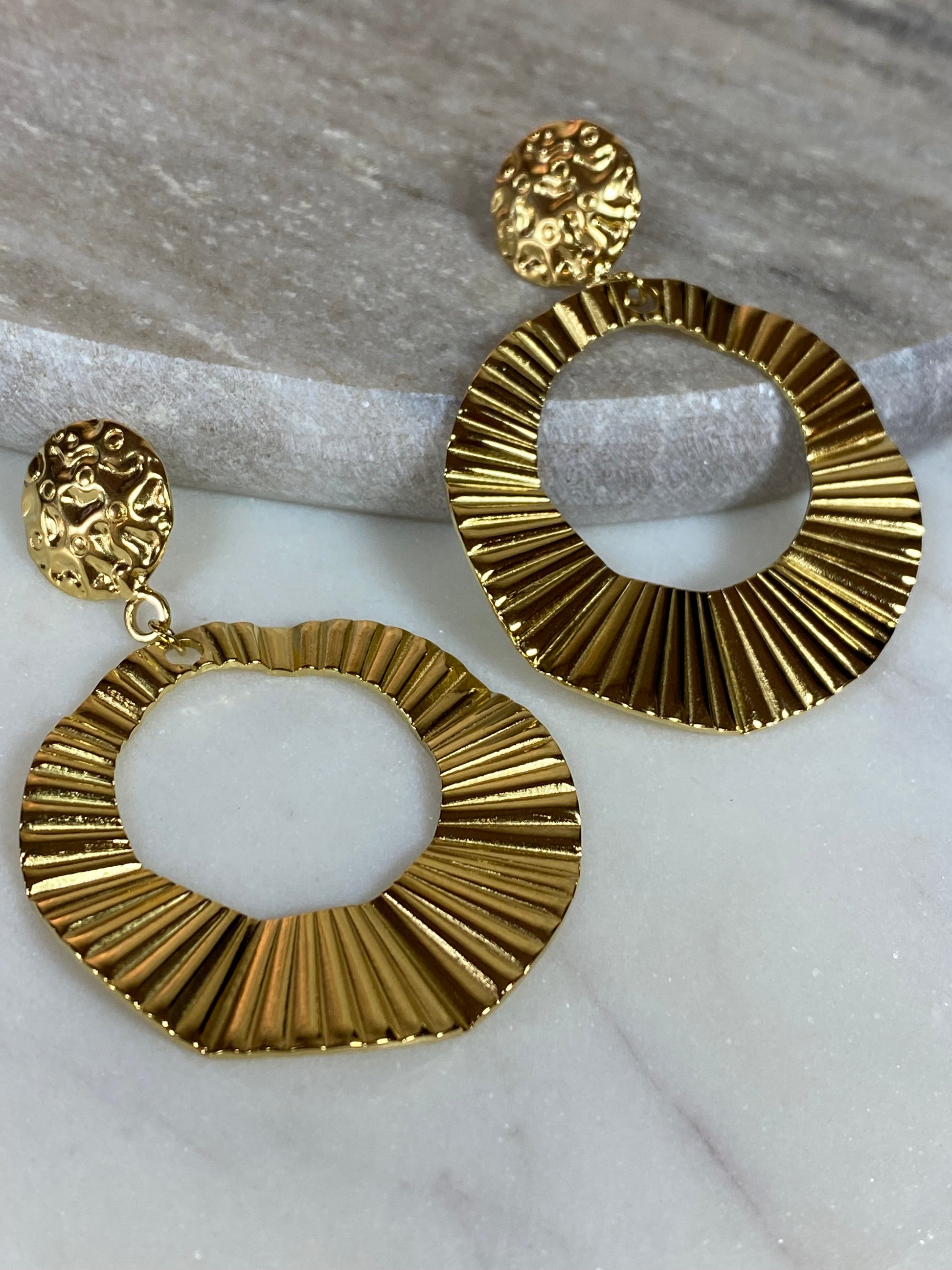 Les boucles d’oreilles Angie sont de somptueuses créoles dorées en acier inoxydable qui ajouteront beaucoup d'élégance à votre tenue. Leur matériau résistant assure une longue durabilité et leur design moderne est parfait pour toutes les occasions. Faites-vous plaisir avec ces boucles d'oreilles tendance qui compléteront votre look avec style.