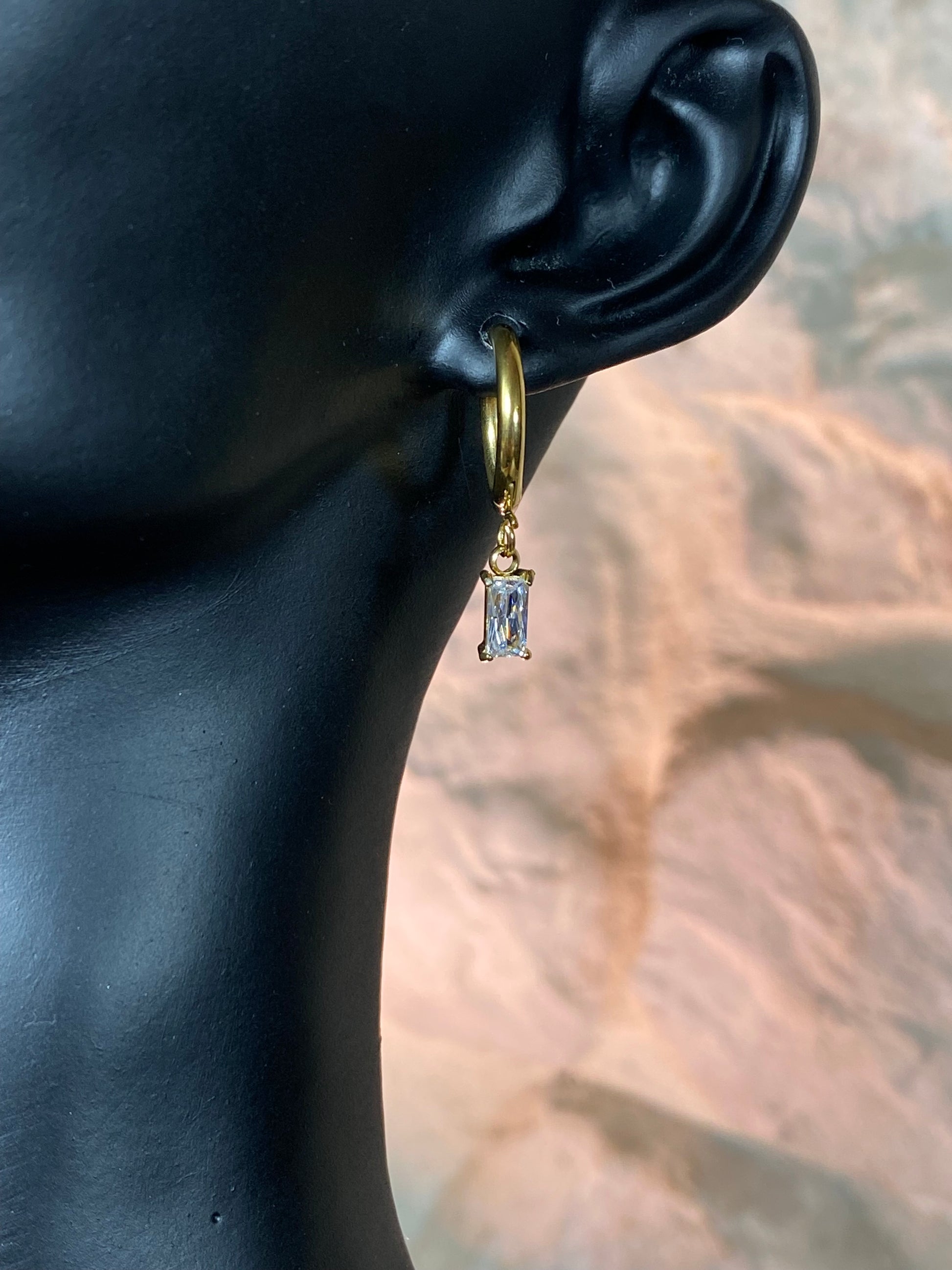 Les boucles d'oreilles en créoles dorées sont ornées d'un pendentif en strass blanc pour un look élégant et scintillant. Fabriquées en acier inoxydable, elles sont résistantes et durables. Ajoutez une touche de glamour à votre tenue avec ces boucles d'oreilles tendance.