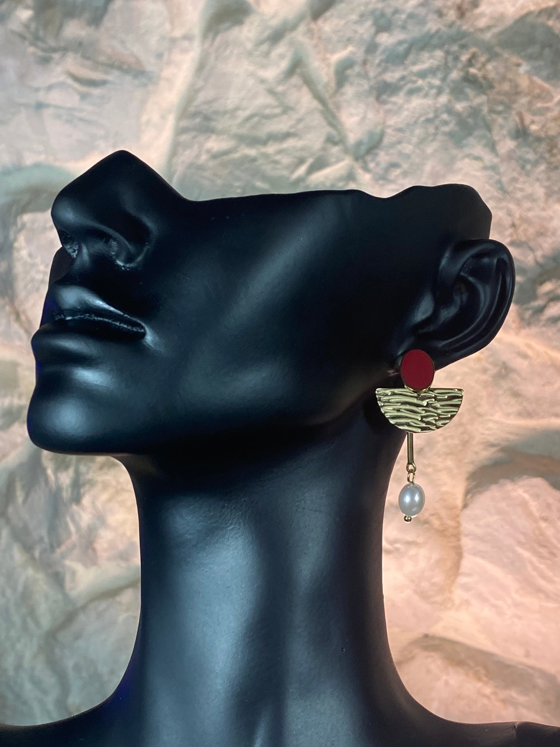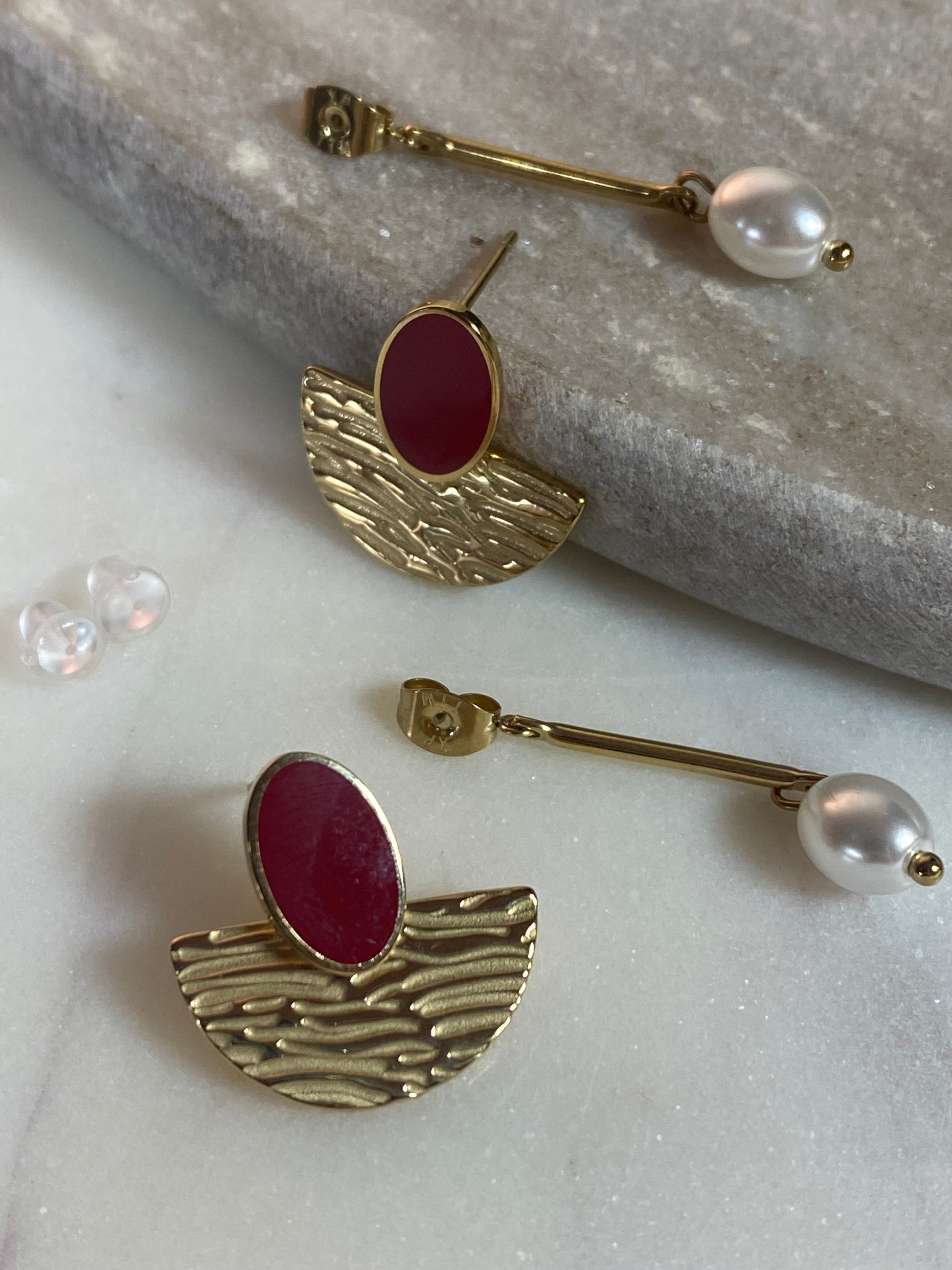 Deux boucles d’oreilles en une, selon votre envie du jour! Ajoutez une touche de classe à votre tenue avec les boucles d'oreilles Kloé en acier inoxydable. L'alliance de doré, de rouge et de perle apporte un charme intemporel. Soyez sûr d'impressionner avec ces boucles d’oreilles!