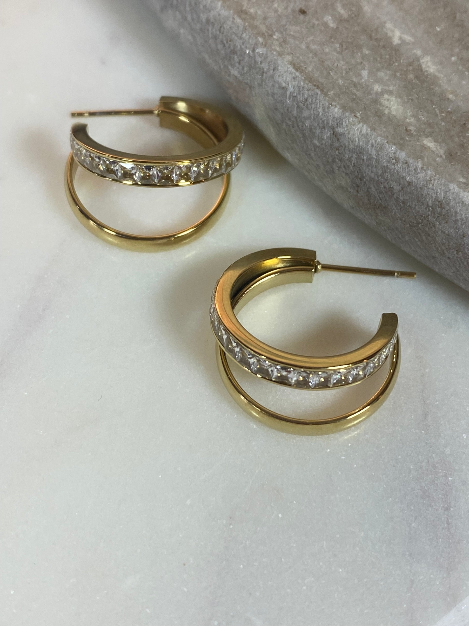 Les boucles d'oreilles Lamba en acier inoxydable se composent de double créoles, dont l'une est ornée de strass étincelants. Elles donnent une touche d'élégance à toutes vos tenues avec ces accessoires de qualité.