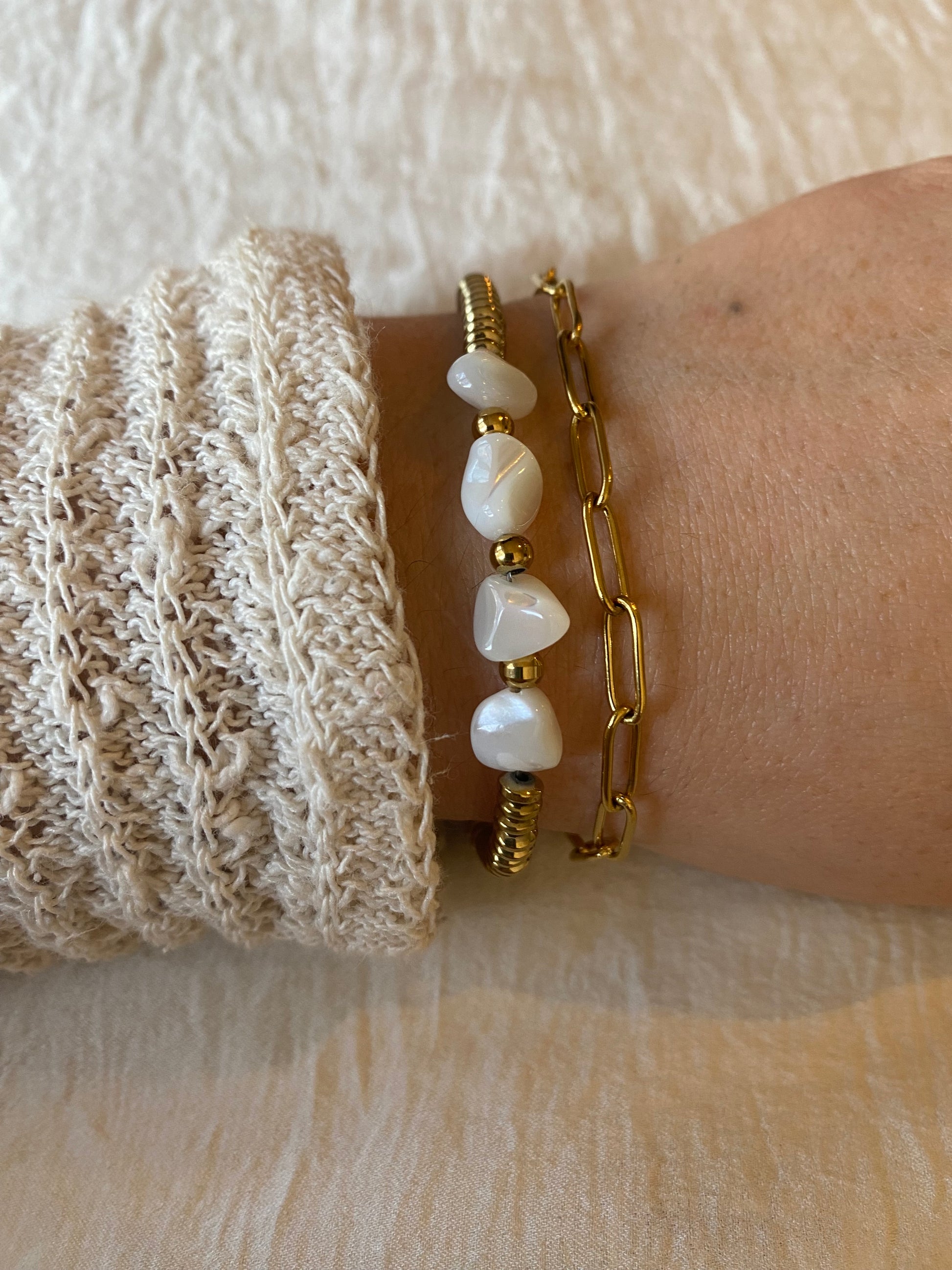 Le bracelet Misy est un accessoire indispensable pour toute collection de bijoux. Formé d’une chaîne inoxydable solide et d’un bracelet de perles agrémenté de nacre, il apporte une touche d'élégance à toutes les tenues. Idéal pour les occasions spéciales ou pour un style quotidien sophistiqué, il vous permet d'obtenir un look chic sans effort.