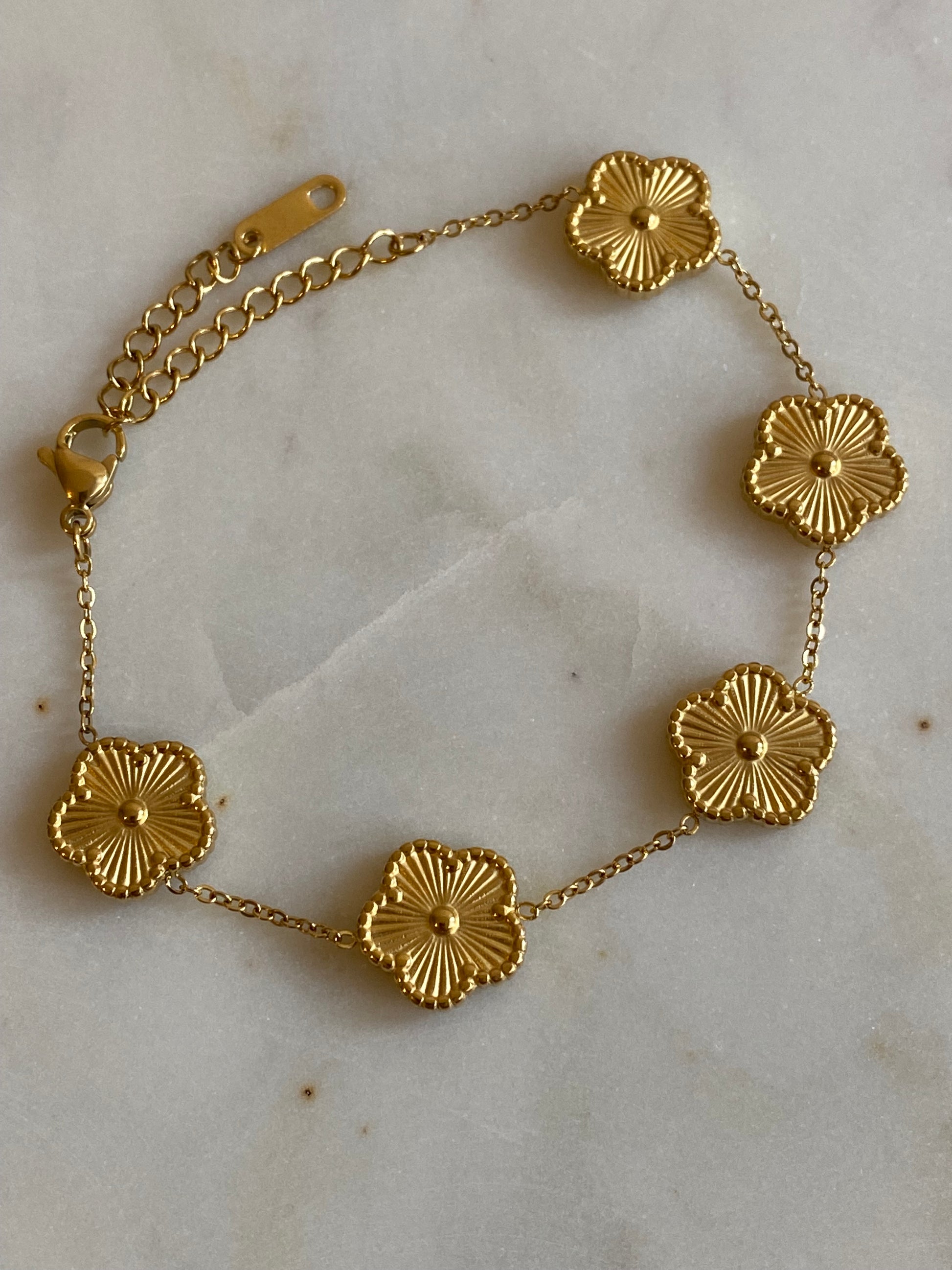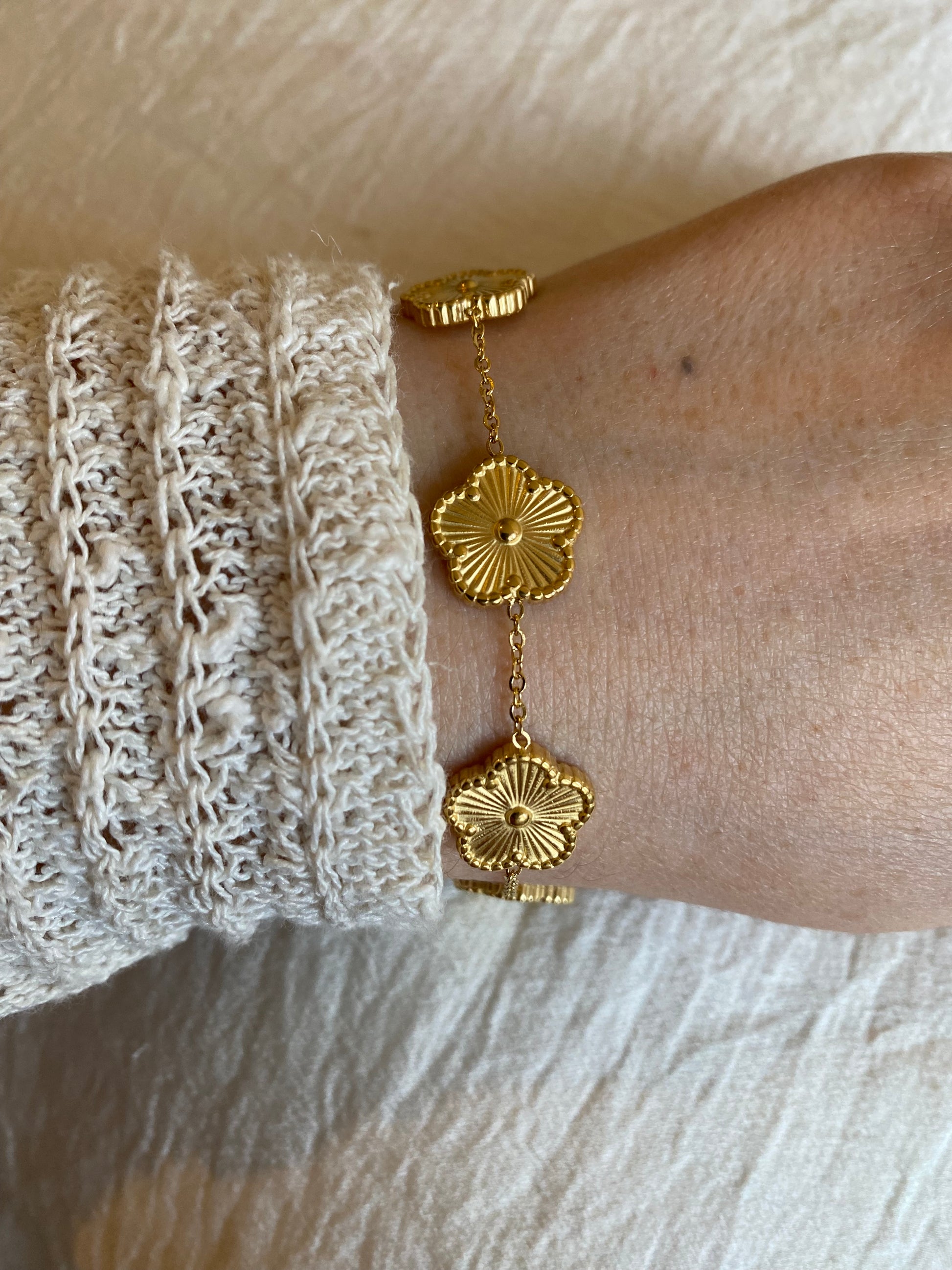 Le bracelet Toba est un bijou élégant avec sa chaine et ses fleurs dorées, fabriqué en acier inoxydable pour une durabilité sans pareil. Ajoutez une touche de luxe à votre tenue avec ce bracelet raffiné.